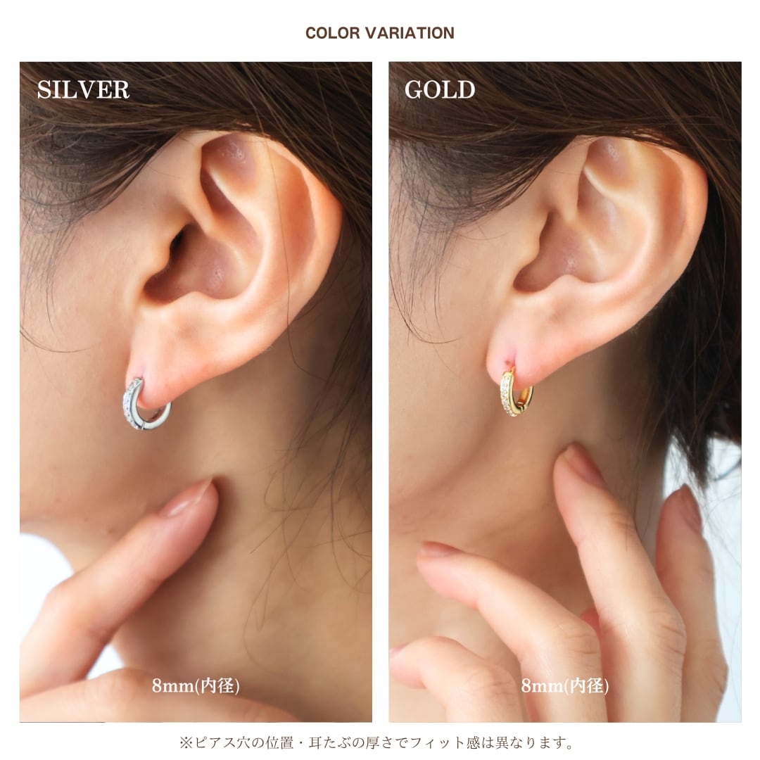 滑らかなラインに沿って、細やかな光がリズムを刻むフープピアス。
